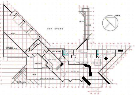 I make a unit system choice very early in the design process. As the design is worked out in the first drawing, it is worked out on a unit system. This drawing starts after I have a general organization of the areas of the design (the PARTS) and after I have a general conception formed in my mind. So, when I start to draw the plan I already have a vision of what this design will be and how it is organized. The drawing is to work it out in detail. I first choose a unit system that will facilitate the design conception that is in my mind. I put the unit system on the site plan and these days it is drawn on a separate layer on the CAD drawing. The floor plan is started on a separate layer over the unit system and over the topographical survey layer.